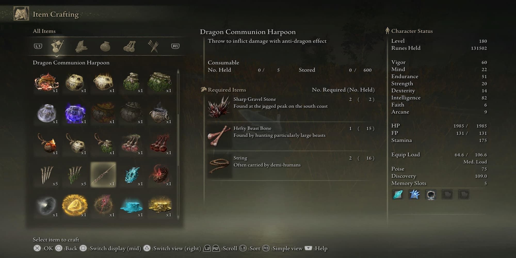 Este es un consumible único en el sentido de que puede ser cargado para aumentar el daño. Tiene un efecto anti-dragón que aumenta aún más su daño a los dragones. En general, estos consumibles son muy útiles con builds de fuerza y deben ser considerados como una opción útil a distancia al luchar contra Bayle El Temido en la cima del Pico Dentado. La única desventaja de estos Arpones es que solo se fabrica uno a la vez, y las Piedras de Grava Afiladas requieren un poco de esfuerzo para encontrarlas, así que asegúrate de guardar estos arpones para los jefes dragón principales.