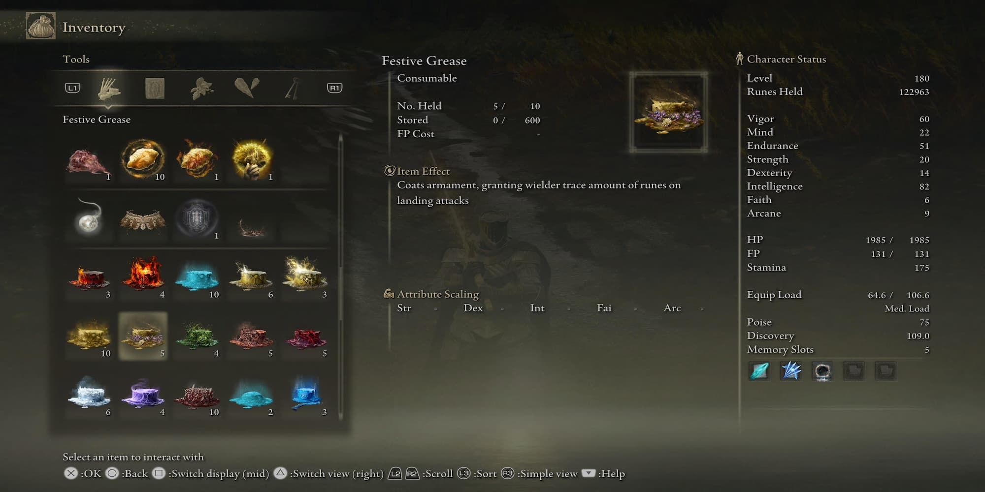 Cuando se aplica a un arma que no tiene ya daño mágico, la Grasa Festiva dará a los jugadores runas adicionales al golpear a los enemigos. La trampa es que solo ocurrirá en el primer golpe de un combo, y solo necesita golpear al enemigo, incluso si están bloqueando. Golpear a un enemigo con esta grasa aplicada da a los jugadores 25 runas. No importa cuántos enemigos sean golpeados, ya que solo se pueden obtener 25 runas a la vez.