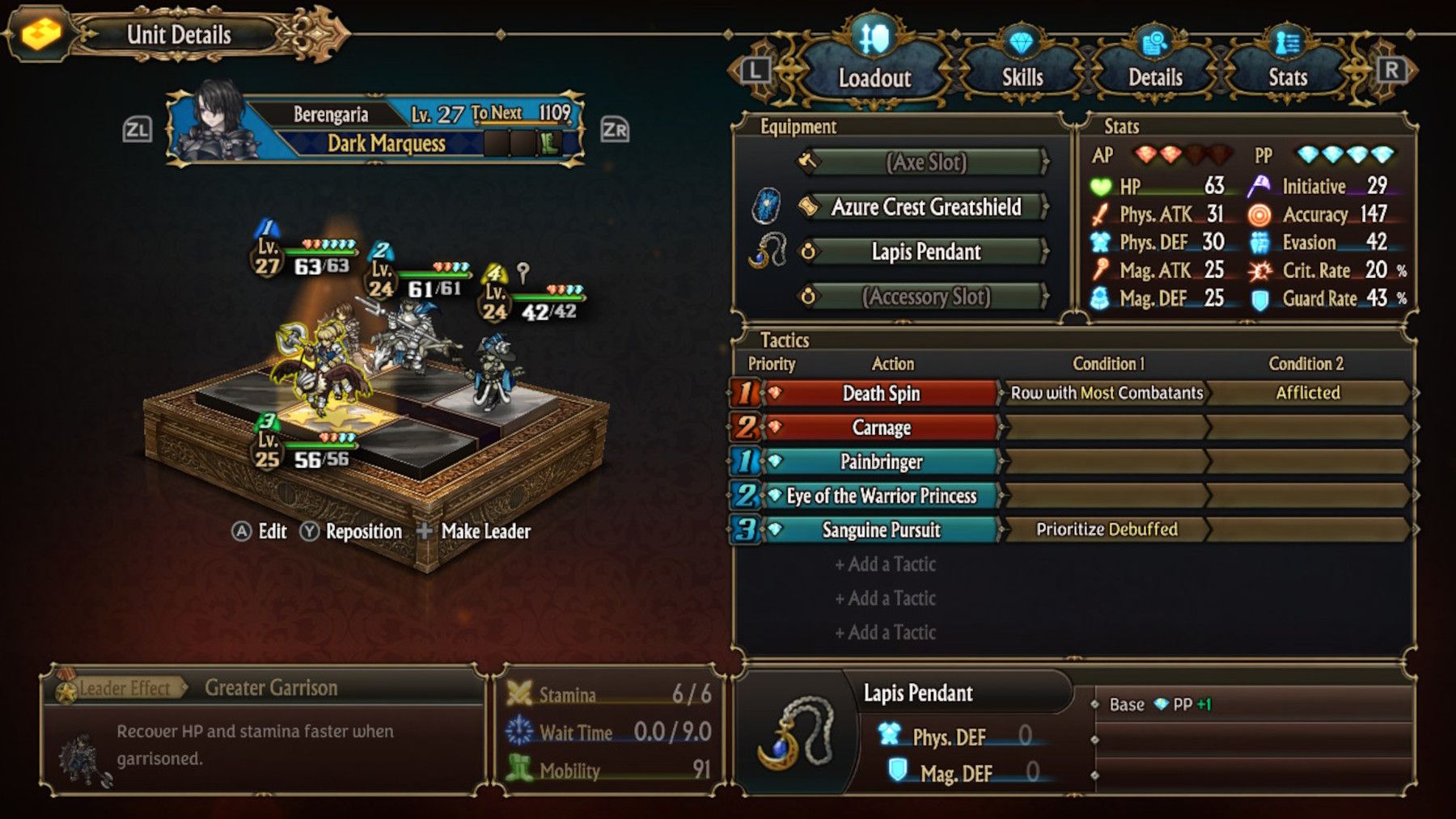 Hay una gran flexibilidad con el equipo necesario para esta composición de equipo, aunque los aficionados a los RPG tácticos deben buscar un equilibrio entre el equipo que aumenta los AP/PP de los personajes y el equipo que les permite sobresalir en su rol. Con respecto a ese primer grupo de equipos, los Pendientes de Cornalina, los Pendientes de Lapislázuli, los Pendientes de Zafiro y los Pendientes de Rubí son todas opciones excelentes, mientras que objetos como el Colgante del Guerrero encajan bien en el segundo grupo.