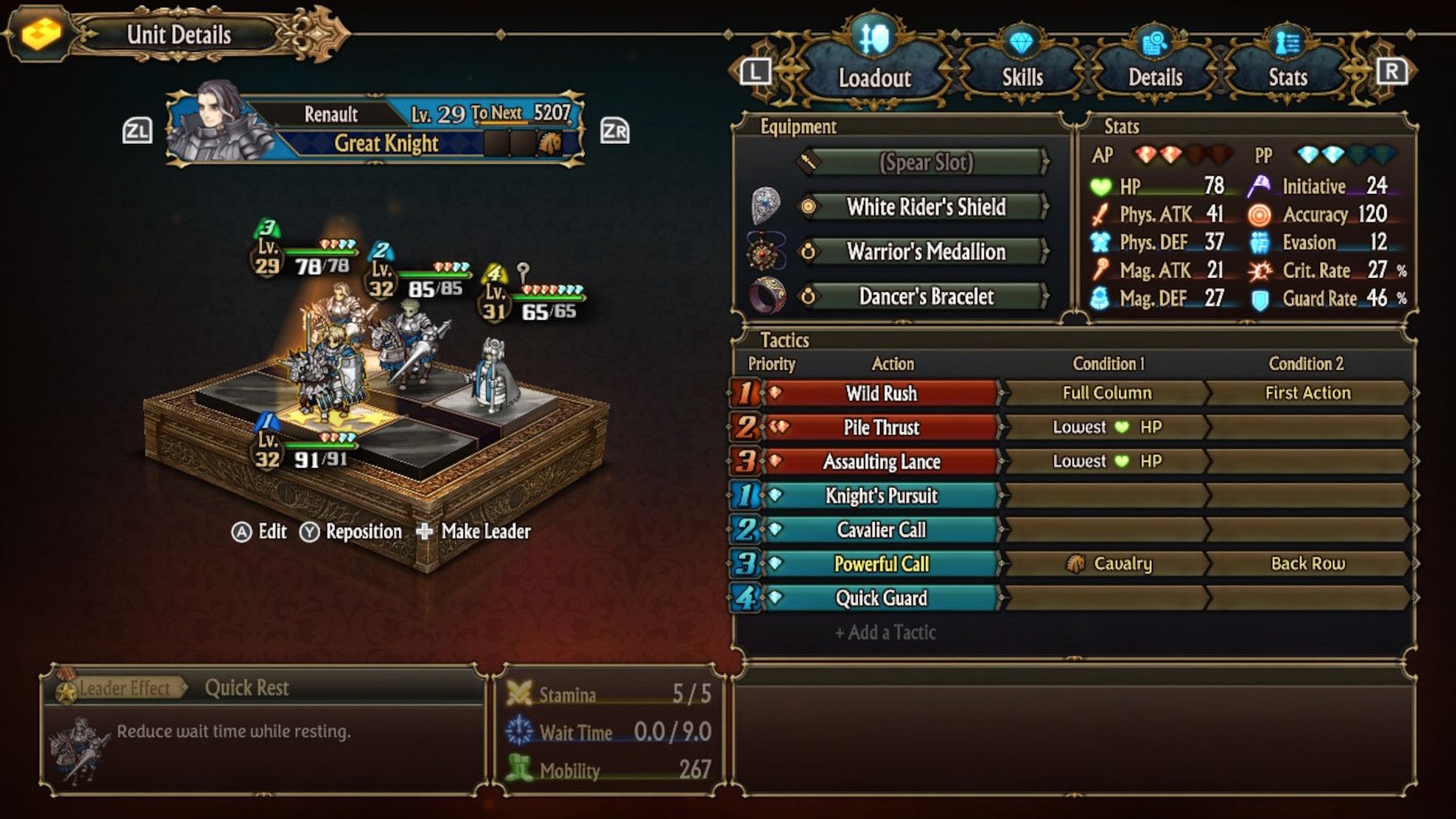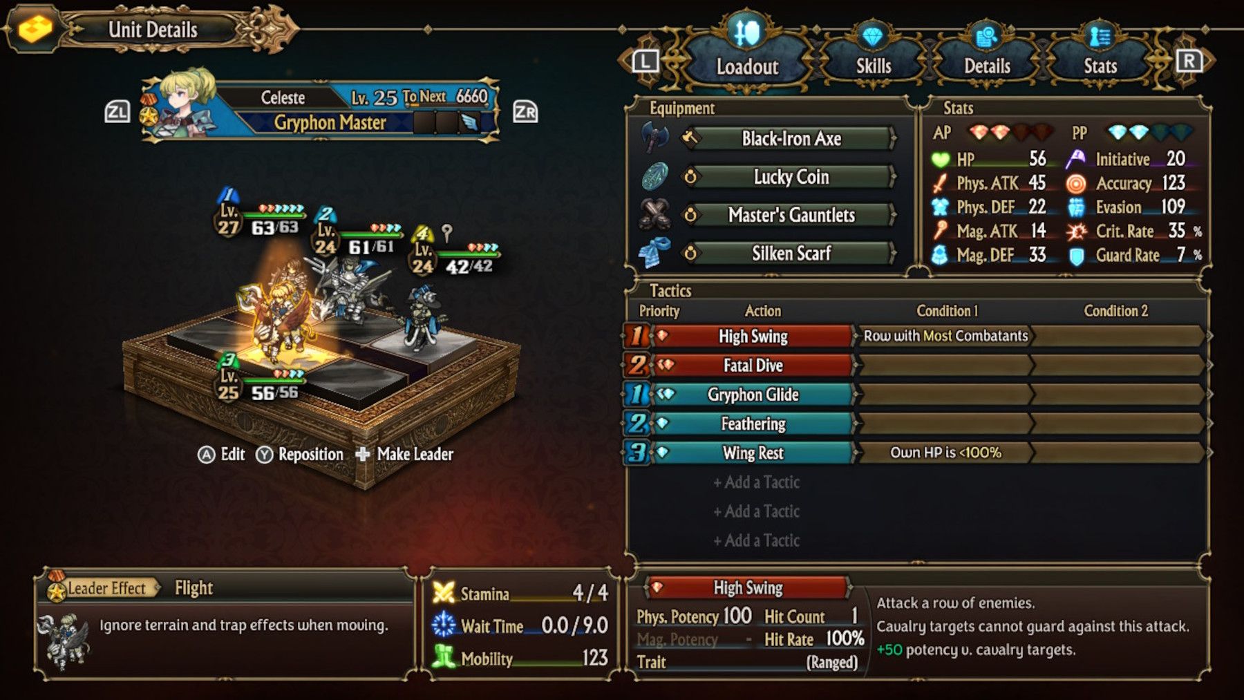 La unidad no solo debe actuar como apoyo, sin embargo, ya que los jugadores pueden usar su cuarto espacio para fortalecer las batallas con las que podrían luchar sus otros equipos. Esto podría significar llenar el espacio con un Guerrero/Rompedor para lidiar con unidades enfocadas en la armadura, o uno de los personajes de rango de Unicorn Overlord para eliminar a los voladores opuestos.