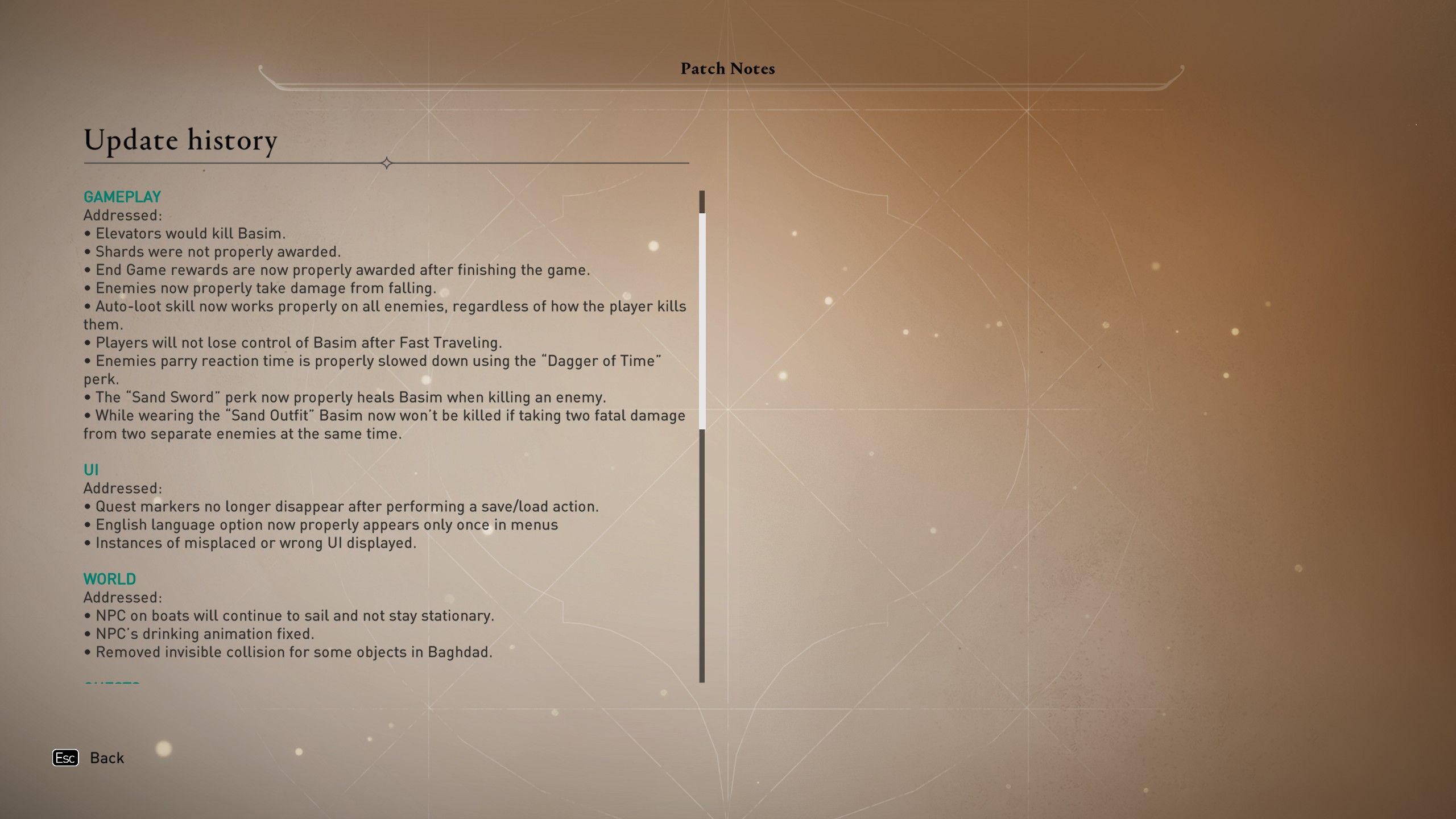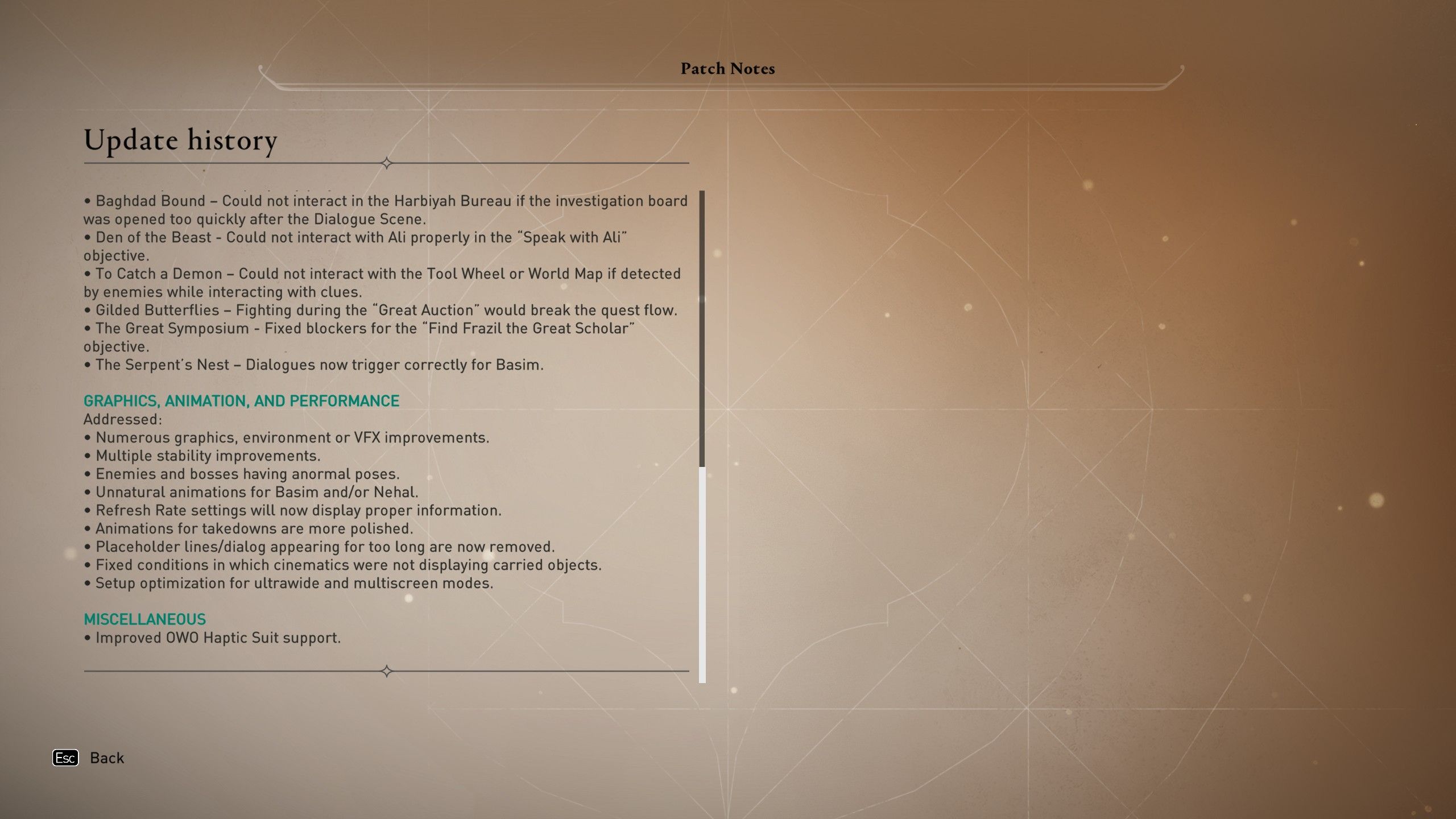 La actualización 1.0.4 parece ser la actualización más modesta del juego hasta la fecha. Aunque pesa casi 3.5GB, su registro de cambios menciona solo una corrección, revelando que los desarrolladores eliminaron un problema que podría haber causado que las cinemáticas no se reprodujeran correctamente. Aparentemente, este problema no estaba afectando a los jugadores de PC, ya que las notas de la actualización 1.0.4 afirman claramente que esta corrección solo se está implementando en las versiones de consola de Assassin's Creed Mirage. Y aunque al iniciar Mirage en PC, los jugadores verán el número de versión 1.0.4 en la esquina inferior izquierda de la pantalla, al hacer clic en el aviso de las notas de la actualización se mostrará el mismo registro de cambios 1.0.2 que ha estado en el juego desde su lanzamiento.