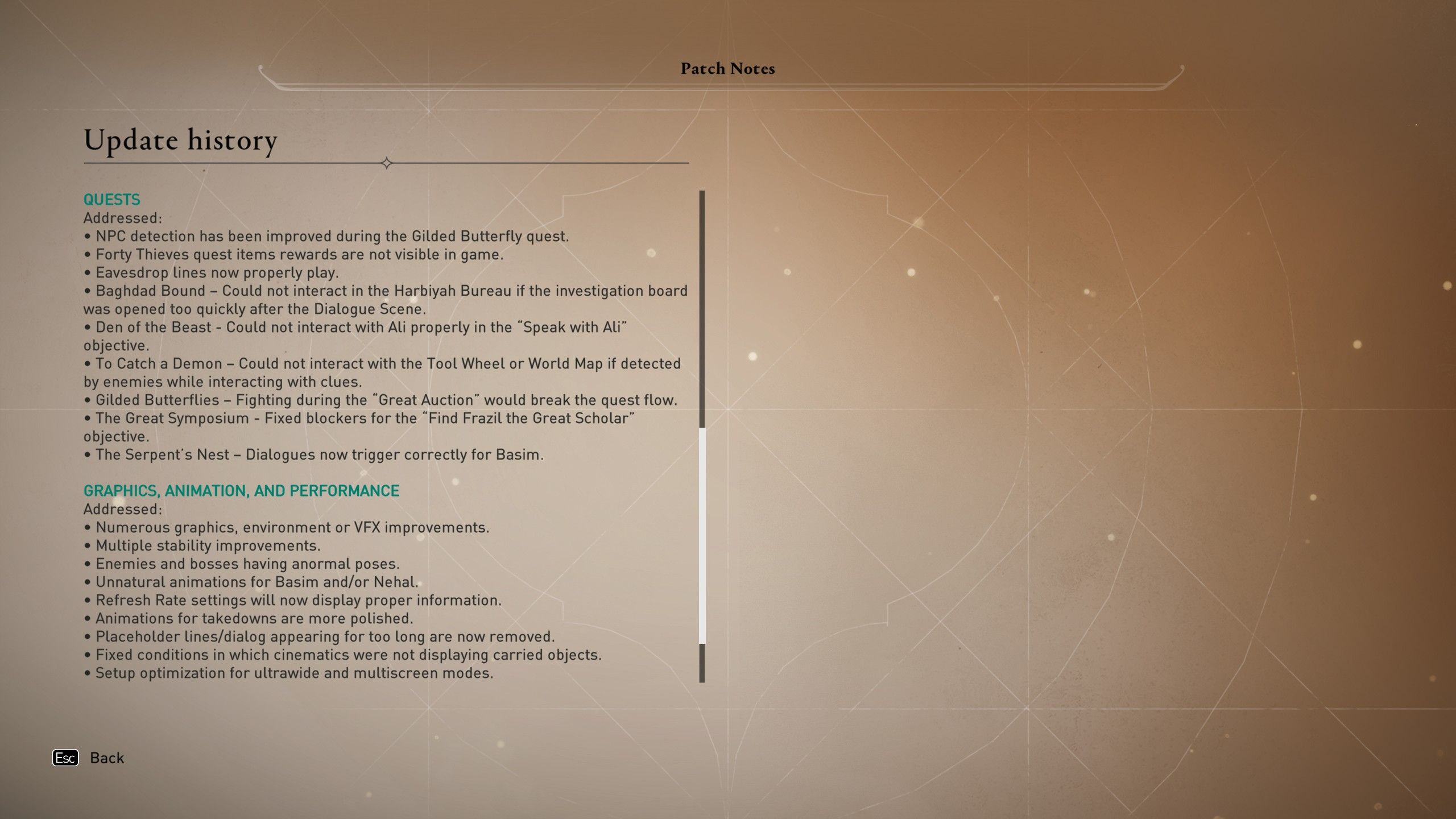 La versión del primer día del juego se incluyó con la actualización 1.0.2, que introdujo una amplia gama de correcciones de errores y mejoras de rendimiento. Ubisoft pronto siguió esa versión con la actualización 1.0.3 que abordó algunos problemas de audio y cuestiones de interfaz de usuario en Assassin's Creed Mirage.