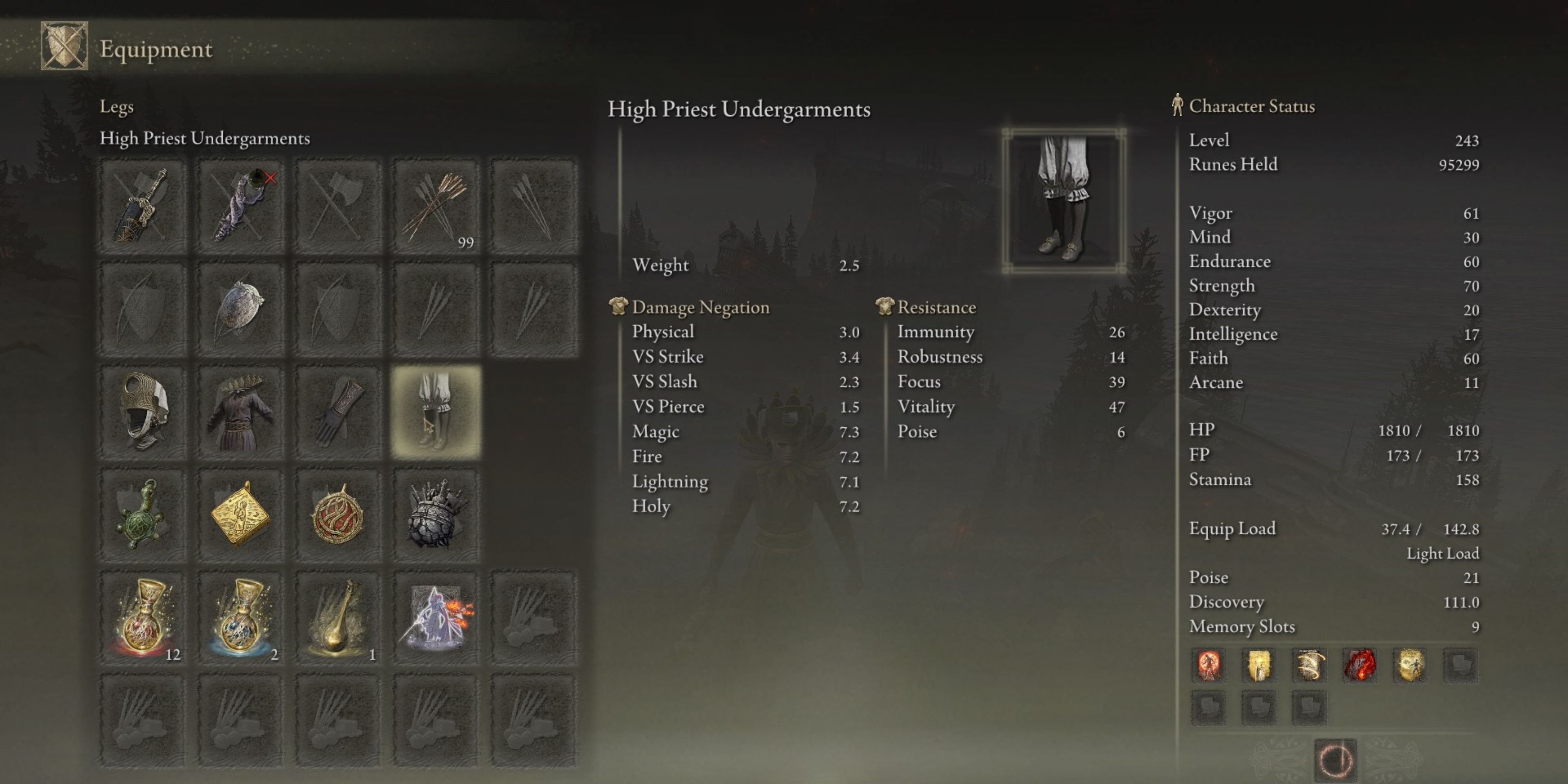 En Elden Ring: Shadow of the Erdtree, el conjunto de armadura del Alto Sacerdote está compuesto por cuatro piezas: el Sombrero del Alto Sacerdote, la Túnica del Alto Sacerdote, los Guantes del Alto Sacerdote y las Ropas Interiores del Alto Sacerdote. Cuando se equipan todas las piezas, el peso total del conjunto del Alto Sacerdote es de 9.8 unidades.