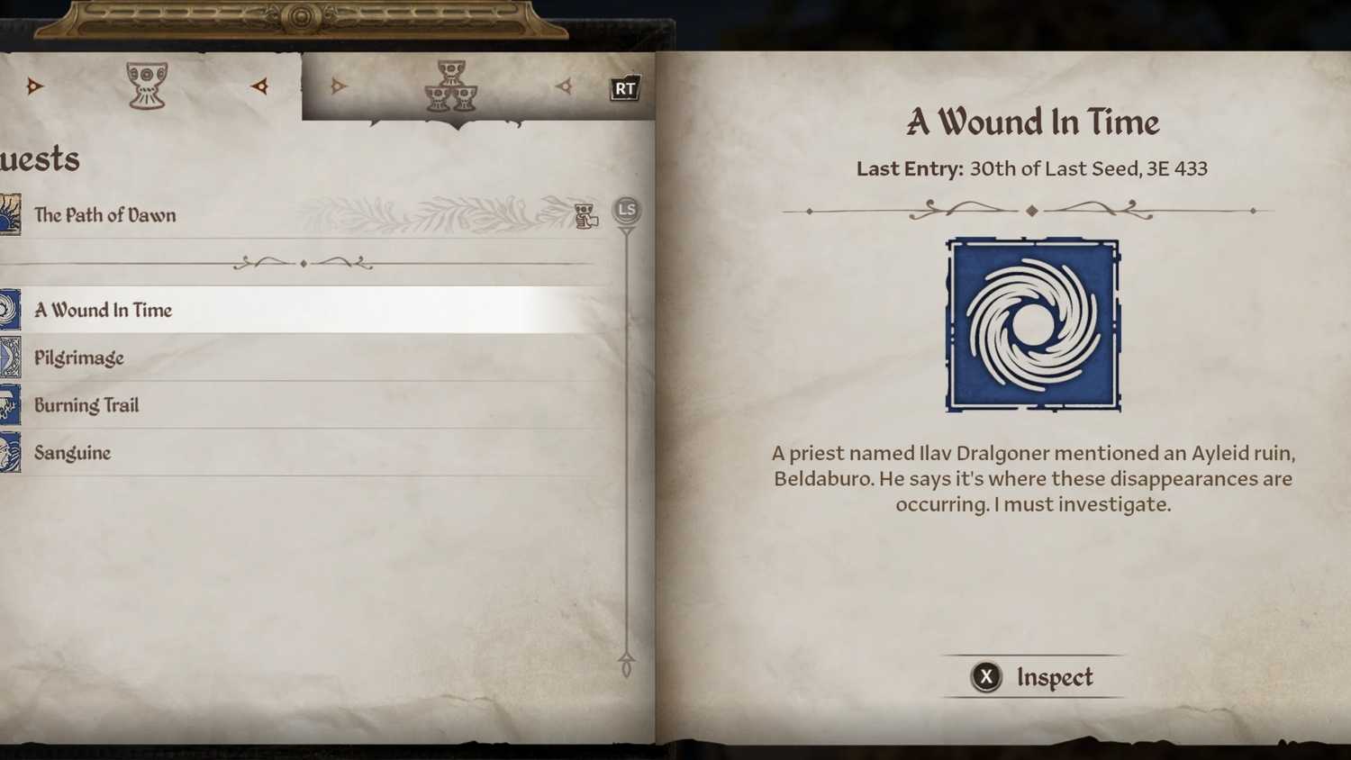 Con esto, se activará la misión en tu diario y te pedirá investigar las ruinas Ayleid de Beldaburo, una zona plagada de enemigos y secretos que guardan pistas sobre alteraciones en la línea temporal.