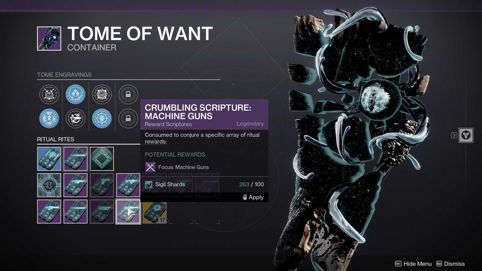 Para garantizar un drop, utiliza el Tome of Want en tu inventario. Gasta 100 Sigil Shards en el segundo renglón de Ritual Rites, seleccionando Crumbling Scripture: Machine Guns. Luego activa el ritual con 5 Essence of Desire. Esto asegura que, al completar actividades del episodio, eliminar enemigos poderosos y jugadores en PvP, recibas un Watchful Eye como recompensa.