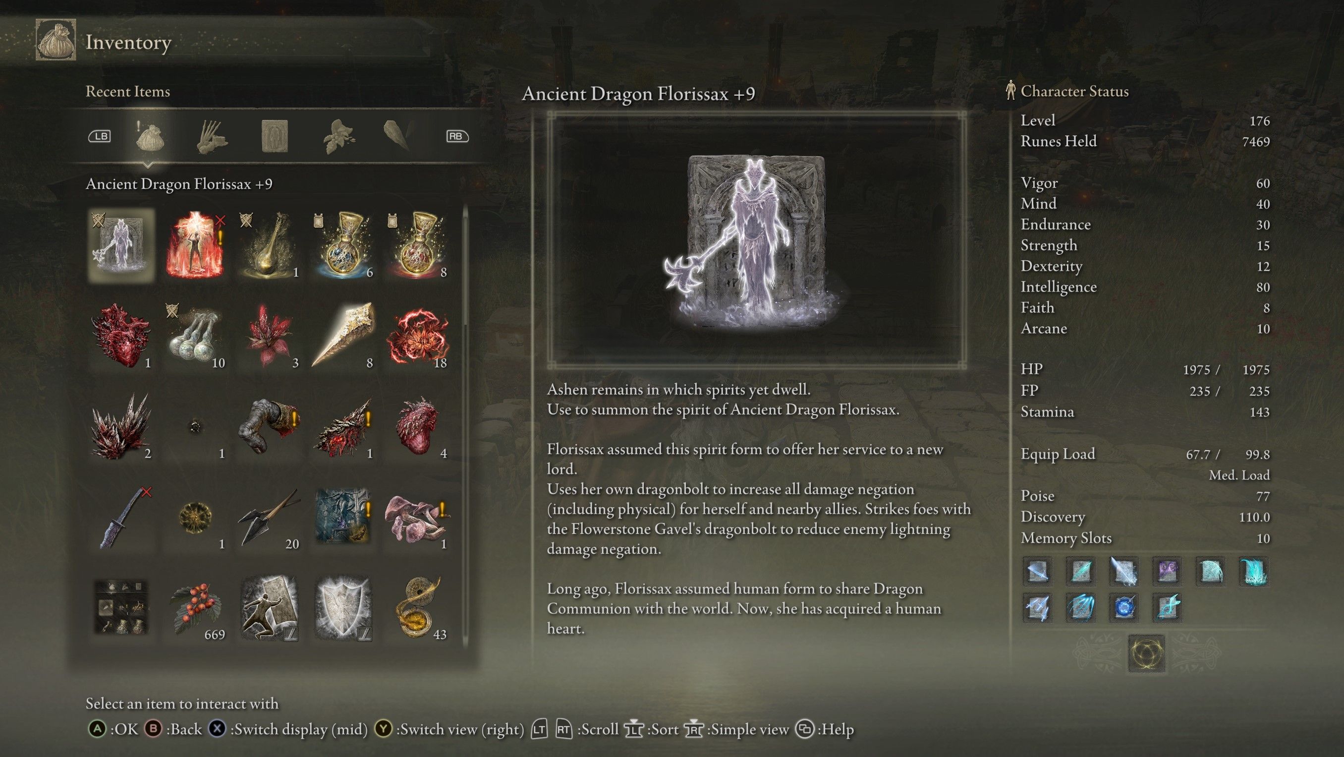 Descansa en el sitio de gracia en el Gran Altar de la Comunión del Dragón y configura la hora a la noche. Luego, interactúa con la Sacerdotisa de la Comunión del Dragón para darle la poción de Thiollier, lo que la hace caer en un sueño profundo. El siguiente paso es derrotar al legendario jefe, Bayle el Temido, y luego hablar nuevamente con la Sacerdotisa. Como resultado de ponerla a dormir, se corta su conexión con el Señor Dragón Placidusax. Después de decirle que la hiciste dormir, decidirá servirte y se transformará en las cenizas del espíritu del Antiguo Dragón Florissax si aceptas su solicitud.
