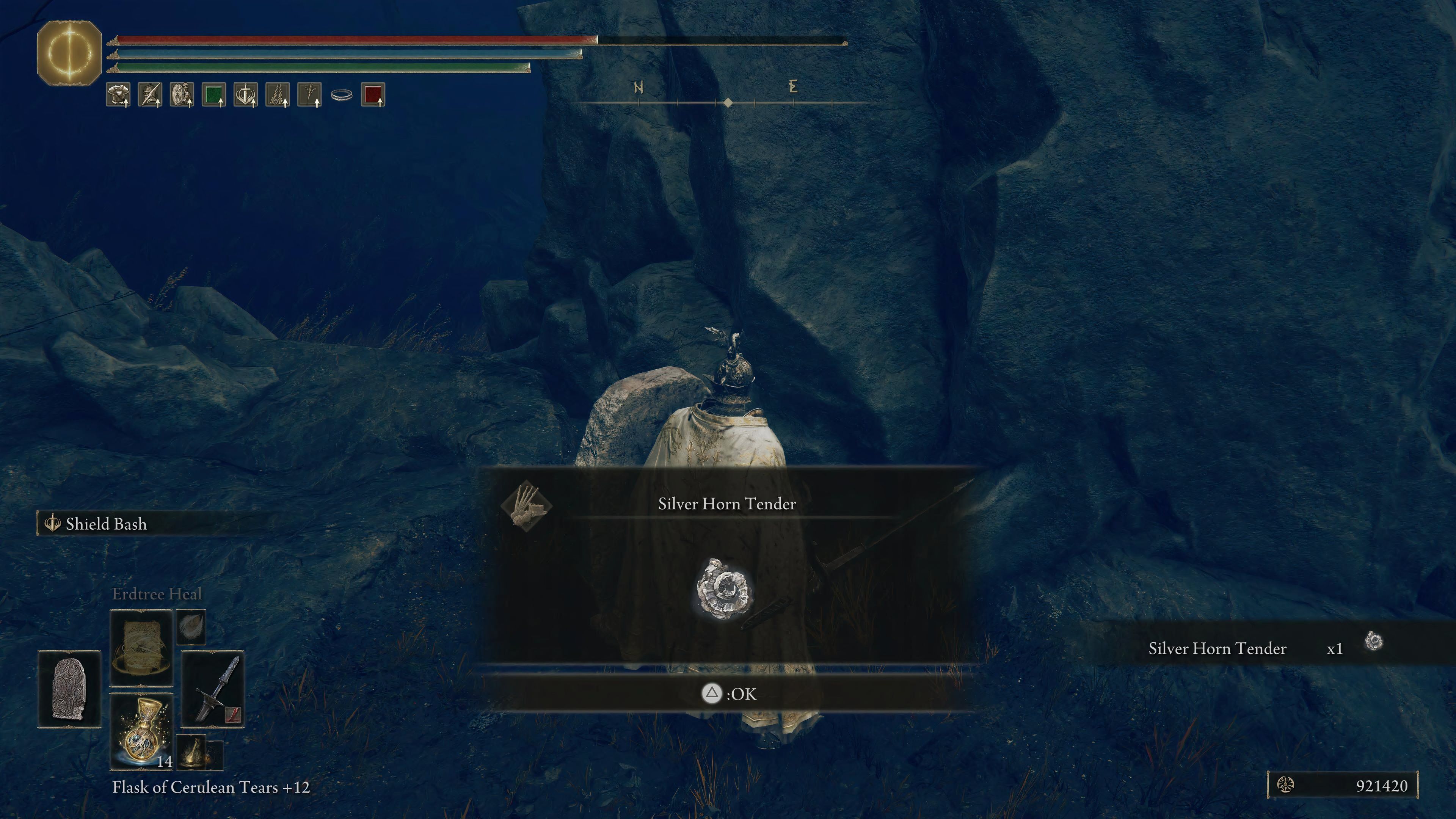 Al oeste de la Aldea, encontrarás un altar. Interactúa y recoge el objeto de este altar para adquirir las Cenizas Espirituales Reverenciadas. Retrocede y dirígete hacia la izquierda subiendo algunas rocas. Habrá varios enemigos aquí, así que trátalos y saquea el cadáver para obtener el Cuerno Plateado Tierno.