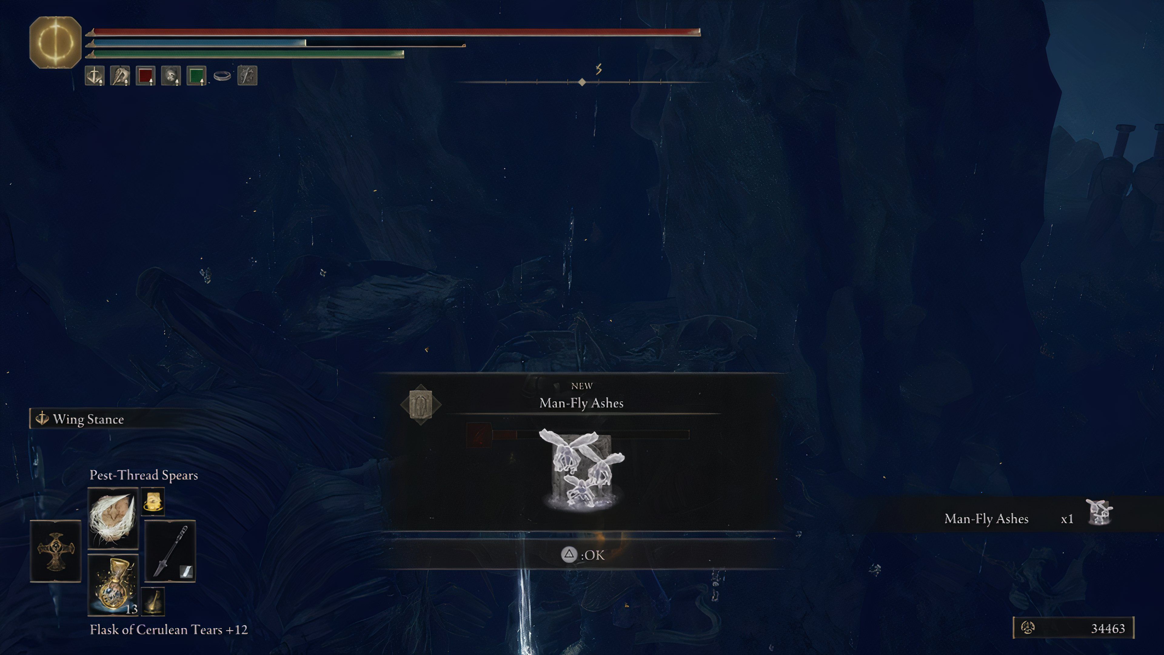 Dirígete hacia el objeto cerca de las macetas, que son las Cenizas Espirituales Hombre-Mosca. Después de adquirir las Cenizas Espirituales Hombre-Mosca, sigue por la pared izquierda para llegar a otro objeto, que es el Cuerno Dorado Tierno.