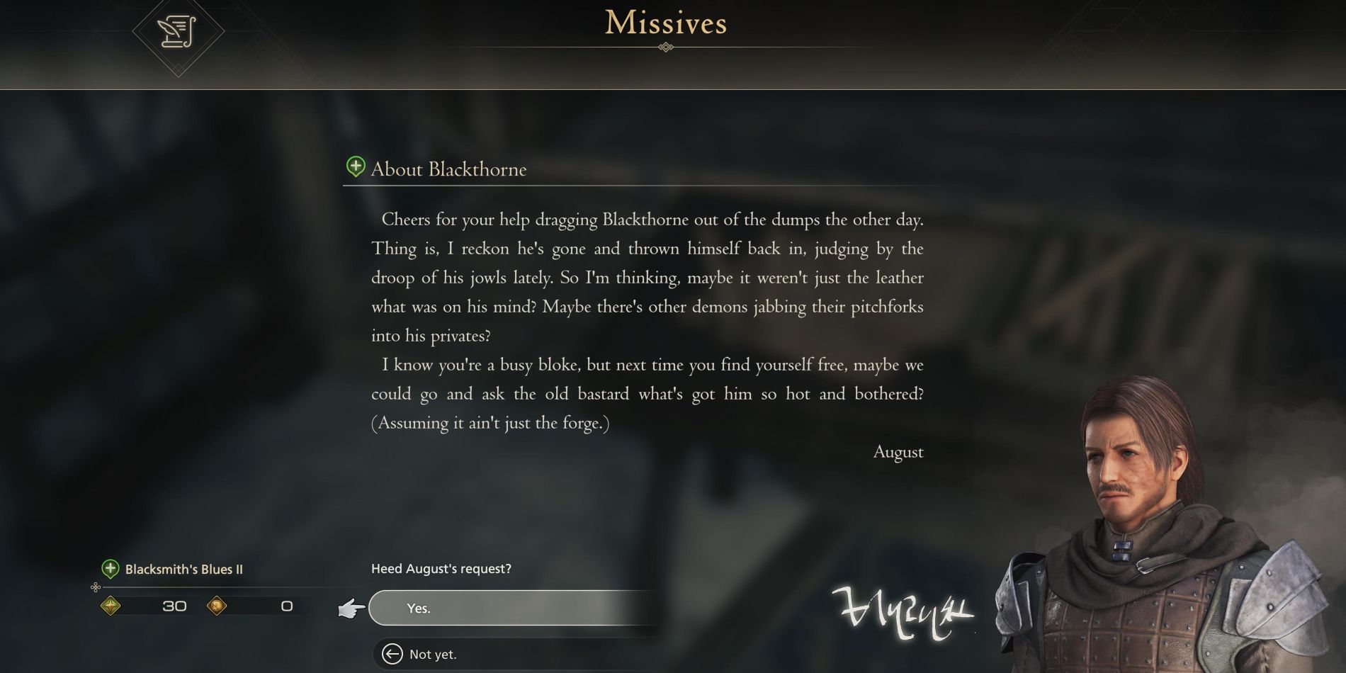 Al igual que en la primera misión, esta aventura comienza con el amigo del herrero, August, solicitando la ayuda de Clive. Una vez más, está preocupado de que su amigo esté perdiendo la pasión por el oficio y le pide a Clive que intervenga nuevamente. Después de que Clive recibe esta información en la carta, irá a hablar con Blackthorne en persona. Esta vez, el herrero ha visto una espada con un filo tan afilado que lo confunde. Será responsabilidad de Clive resolver esto.