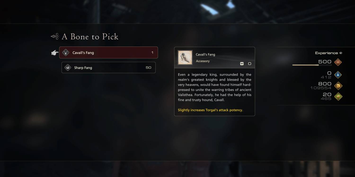 Cuando termine la misión, Clive recibirá 50 Colmillos Afilados y Cavall's Fang, un accesorio que aumenta el poder de ataque de Torgal.