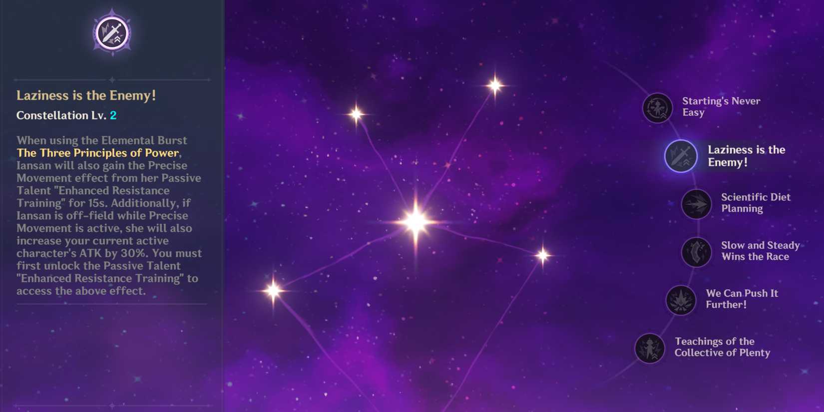 Con esta constelación, Iansan pasa de ser buena a excelente. El buff adicional de ATK se suma al que ya otorga naturalmente, haciéndola una buffer de primer nivel, especialmente útil con personajes que escalen con ATK base.