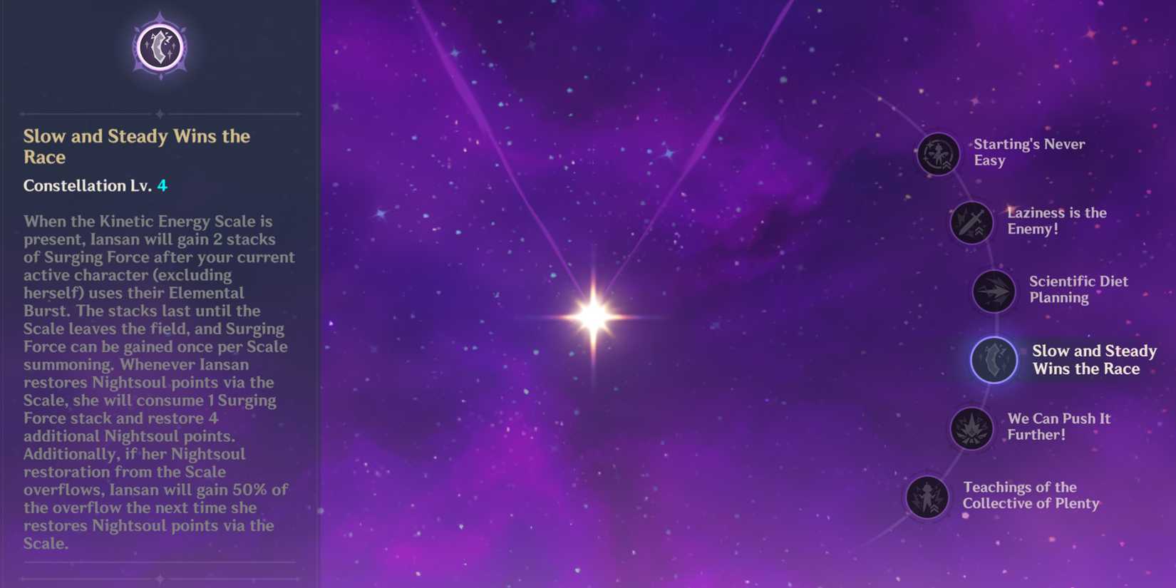 Esta constelación mejora la eficiencia de su recurso principal, permitiéndole mantenerse más tiempo fuera del campo sin perder impacto. También es clave para activar efectos posteriores como su C6.