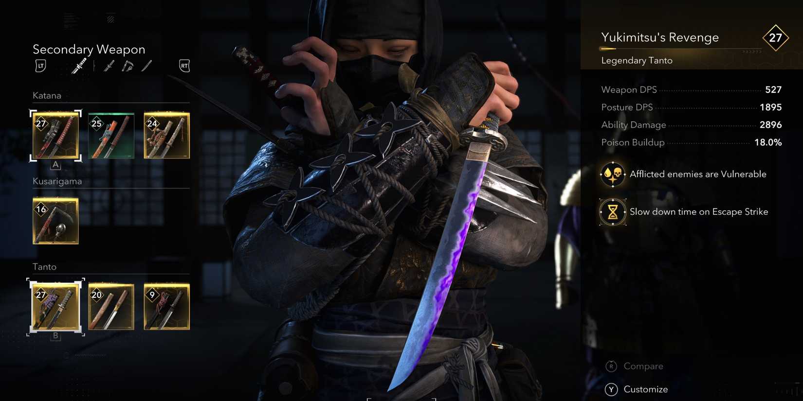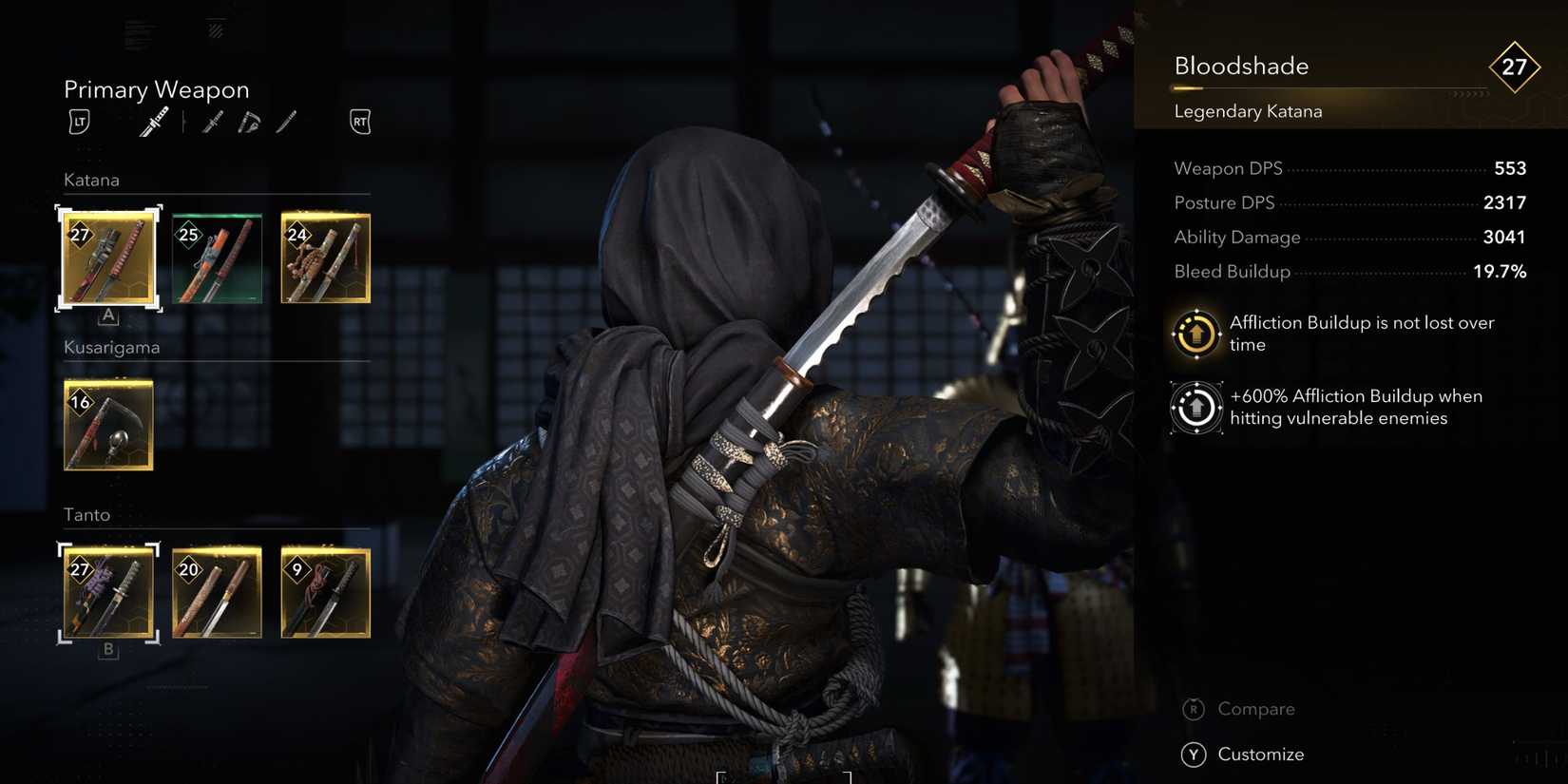 El tanto Yukimitsu’s Revenge encaja perfectamente con la Bloodshade, ya que convierte a los enemigos afligidos en vulnerables a golpes críticos. Esto aumenta considerablemente el daño en combos rápidos.