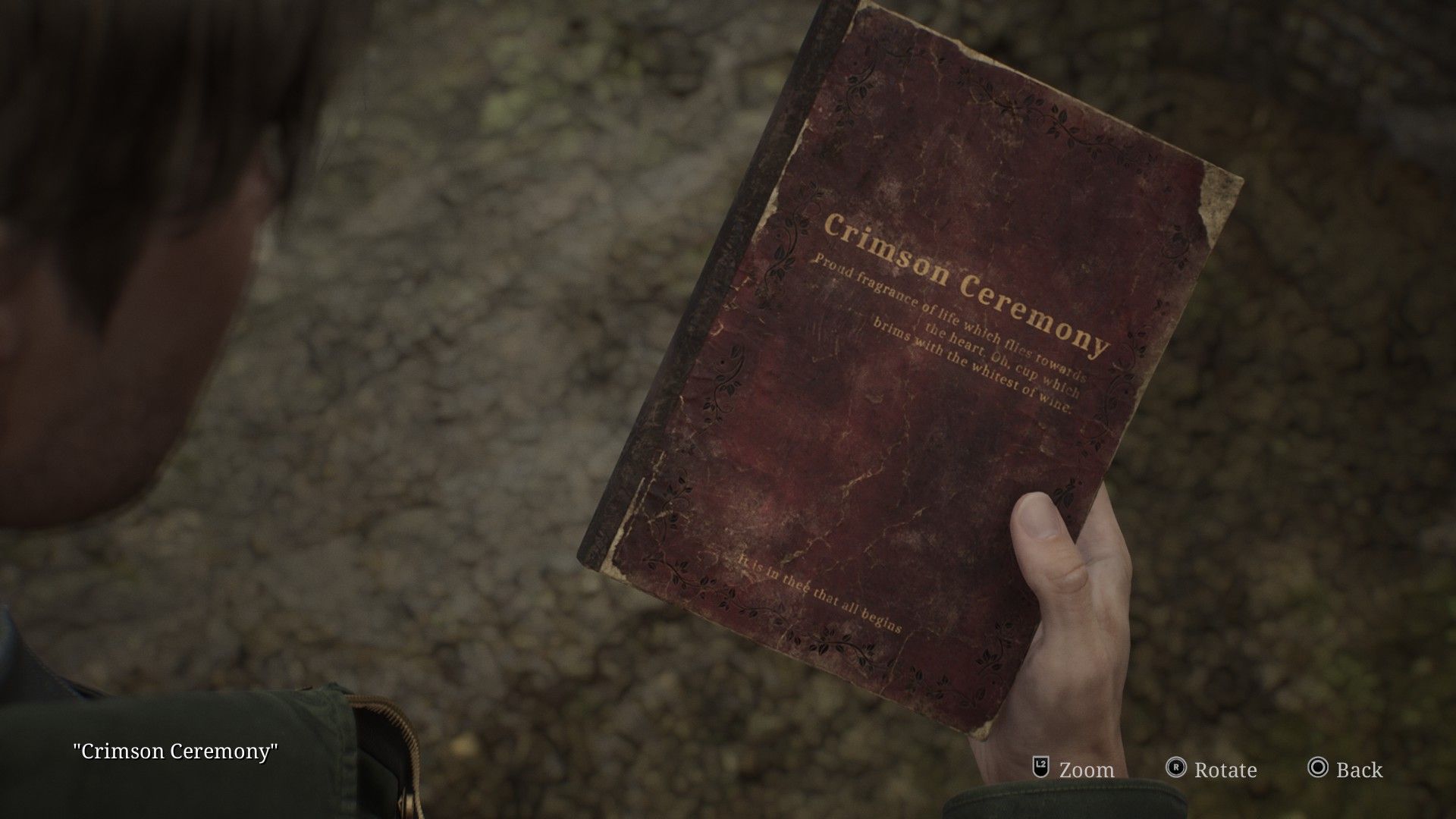 Al comenzar la nueva partida, dirígete desde el coche de James al cementerio, donde te encontrarás con Angela. Después de la escena, permanece en el cementerio y camina hacia el norte siguiendo la pared hasta llegar al lago. Busca una tumba con una grieta y un símbolo de un ojo en la lápida. Ahí encontrarás el primer objeto ritual: Crimson Ceremony.