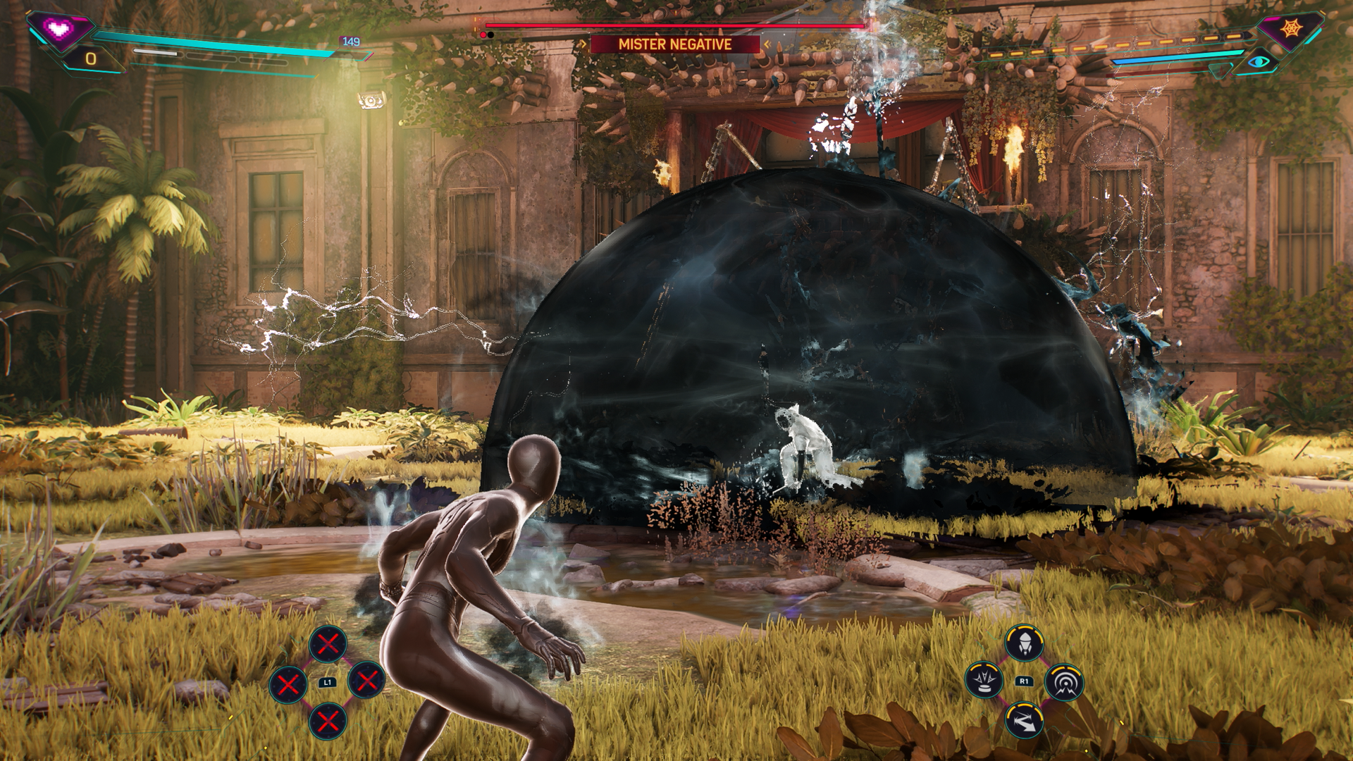 Esto resultó en dos conjuntos de entradas de botones faciales, uno mientras se presiona L1 y otro mientras se presiona R1. Presionar uno de estos botones mientras también se presiona un botón facial ahora permite que el primero active habilidades y el segundo active gadgets, lo que significa esencialmente que Insomniac tendría que limitar a sus Spider-Men a cuatro gadgets (excluyendo una lanzatelarañas predeterminada que siempre está equipada ahora).