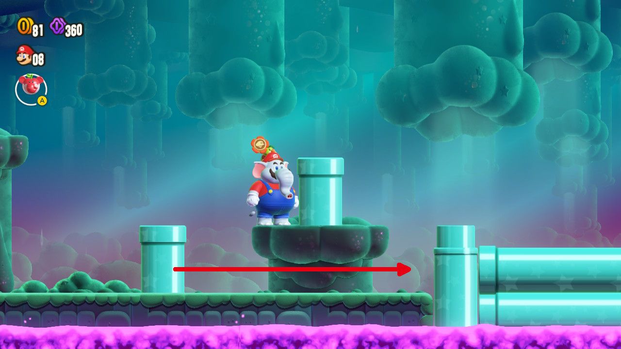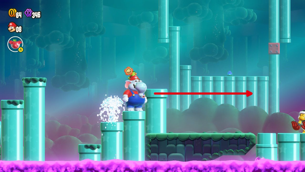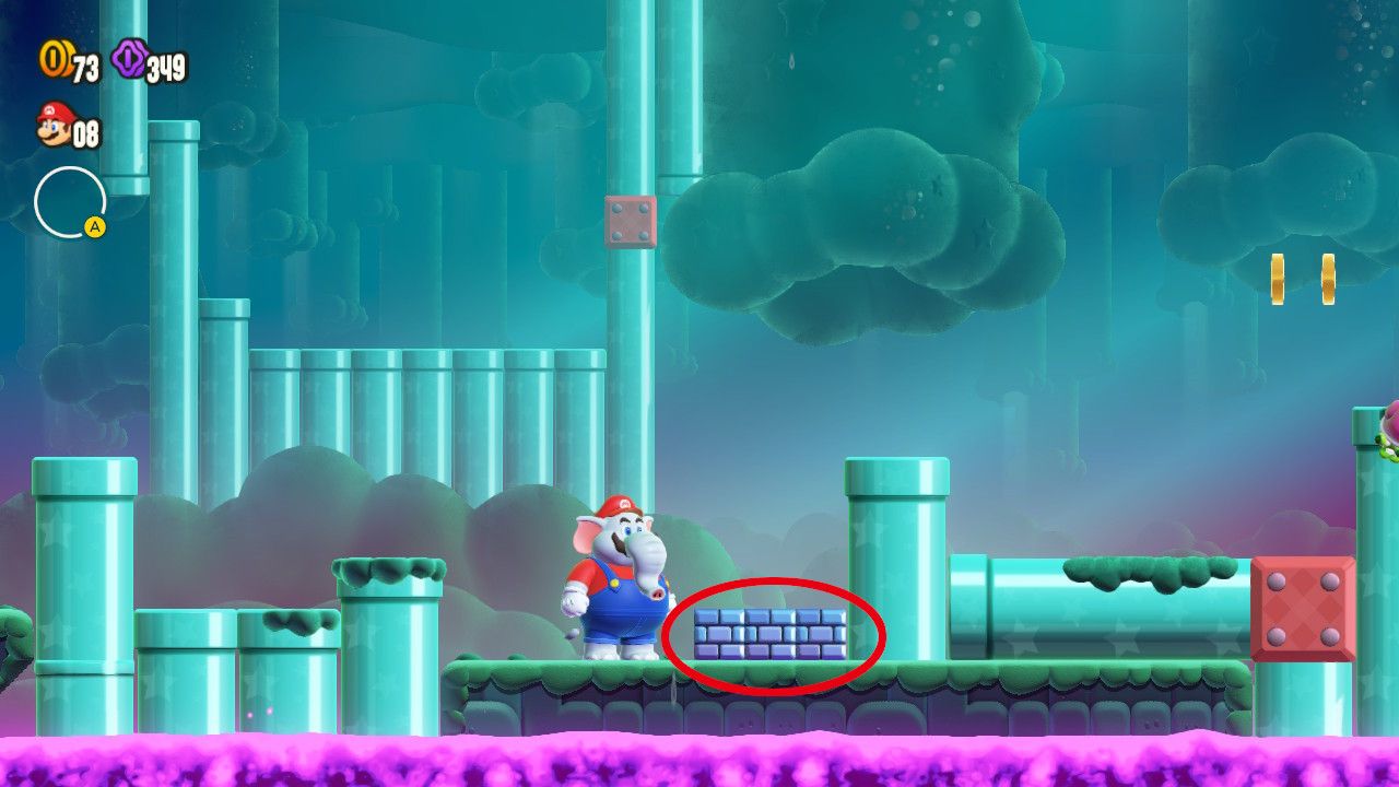 Después de regresar al primer plano, los jugadores deben caminar unos pasos hacia la derecha para encontrar tres bloques de ladrillos, que deben ser destruidos con el trompo de Elephant Mario o con un caparazón cercano. Una vez que esos ladrillos han sido demolidos, los fanáticos deben posicionarse a la derecha de la tubería vertical contra la que se presionaron los bloques y empujarla hacia la izquierda. Esto permitirá entrar en el lado izquierdo de la tubería horizontal, dándoles acceso a una subárea con la segunda Moneda Púrpura.