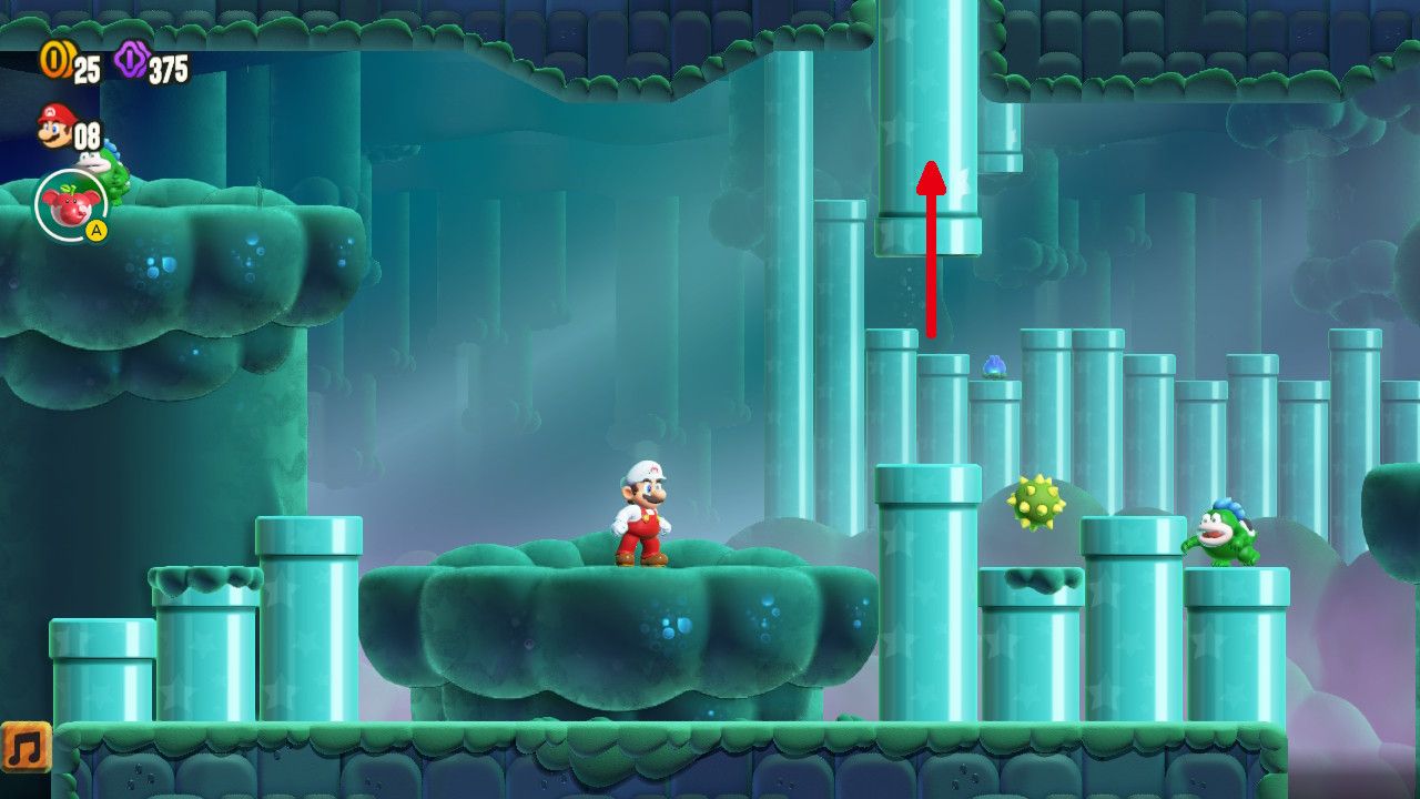 Una vez que el jugador haya regresado al primer plano, debe continuar hacia la derecha para llegar a una fila elevada de bloques de notas. La segunda Moneda Flor Púrpura está en la cima de esos bloques, y los fans deben tener cuidado de evitar los proyectiles del enemigo Mario Wonder mientras intentan agarrarla.