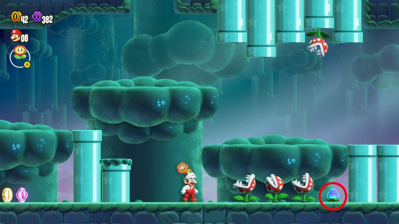Los fans encontrarán una flor suspendida inmediatamente después de recoger la tercera Moneda Flor Púrpura, y al entrar en contacto con ella, enviará una esfera de luz hacia abajo. Cuando eso ocurra, los jugadores deben pararse en la tubería con la flor parlante y dejar que se hunda más allá de la parte inferior de la pantalla. Esta acción enviará a los fans a una subárea con una Flor Maravilla, y recibirán la primera Semilla Maravilla al final de esta sección.