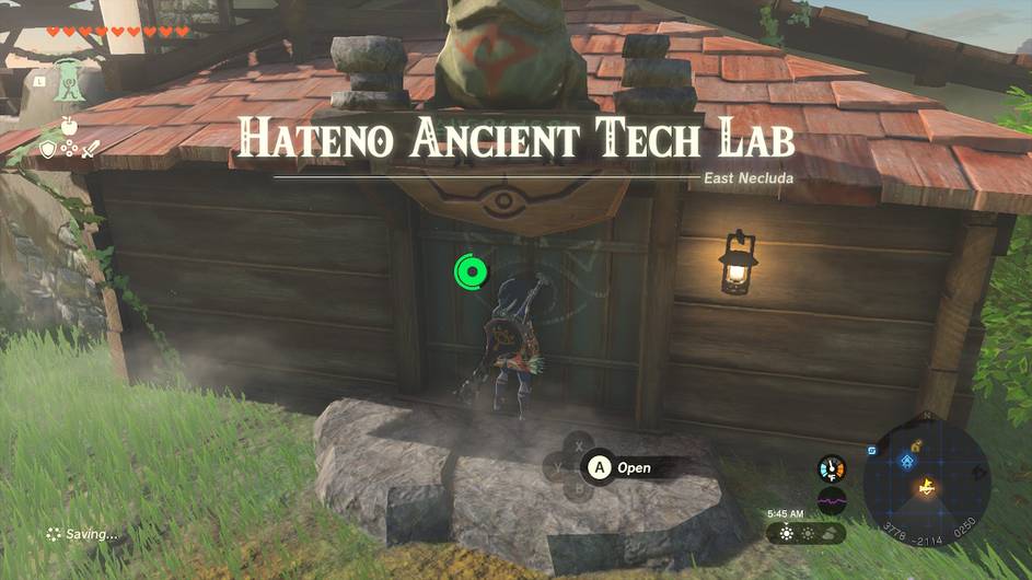 Robbie, el excéntrico investigador que solía trabajar en el Laboratorio de Tecnología Antigua de Akkala. Es un lugar que los jugadores visitaban con frecuencia para mejorar su Sheikah Slate, y cumple un propósito similar en Tears of the Kingdom. Link es guiado aquí como parte de una misión para obtener la mejora del Sensor, que emite señales cuando los jugadores se dirigen hacia un Santuario, pero no es evidente de inmediato dónde se encuentra realmente el Laboratorio de Tecnología Antigua de Hateno, incluso después de llegar a Hateno Village.